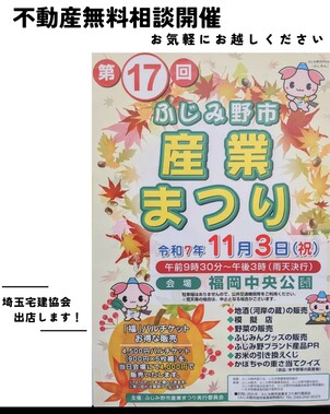 市政施行20周年を迎えたふじみ野市、毎年11月3日に開催される産業まつりに今年も不動産フェアと無料相談会をふじみ野市都市政策部建築課の方々とブースを出展しました。