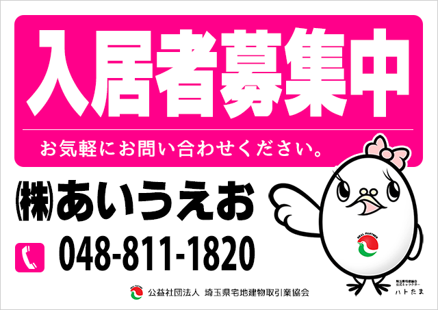 協会マスコット「ハトたま」を使った可愛らしい販促用POP(管理看板)が無料でご利用いただけます。 物件等に貼り出す販促用POP(広告)をご用意しました。A4判とA3判の2種類から選べます。