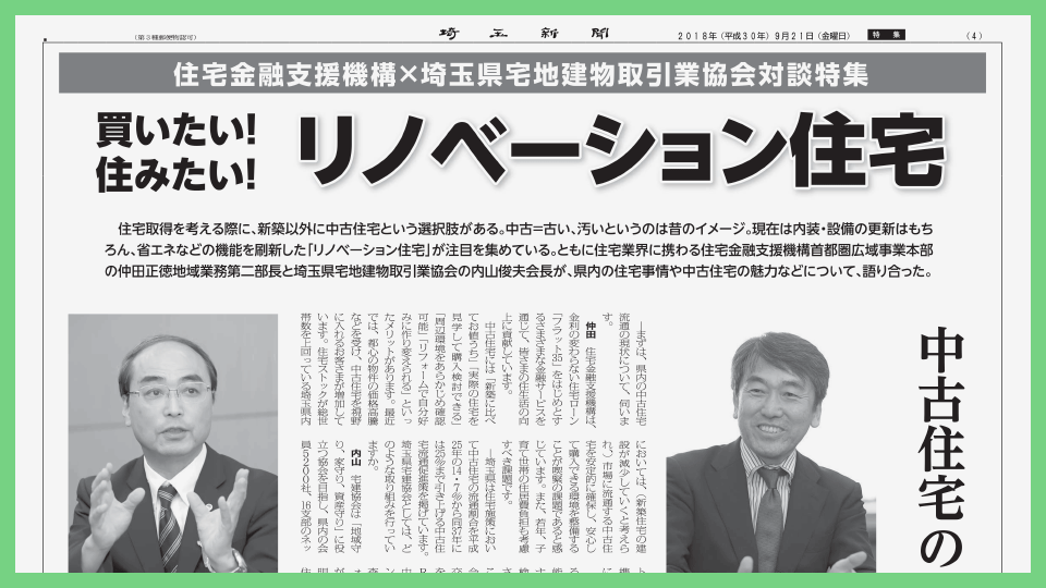 「リノベーション住宅」をテーマに、住宅金融支援機構 首都圏広域事業本部の仲田部長様と本会の内山会長の対談を取り上げています。