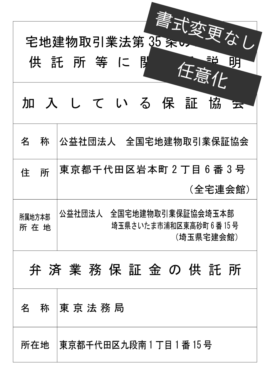 専任の宅地建物取引士につきましては、しております。すでに掲示いただいておりますをお願いいたします。なお、供託所等に関する説明につきましては、書式変更はありませんのでそのままご利用いただくか、任意となりますので破棄いただくかの対応をお願いいたします。