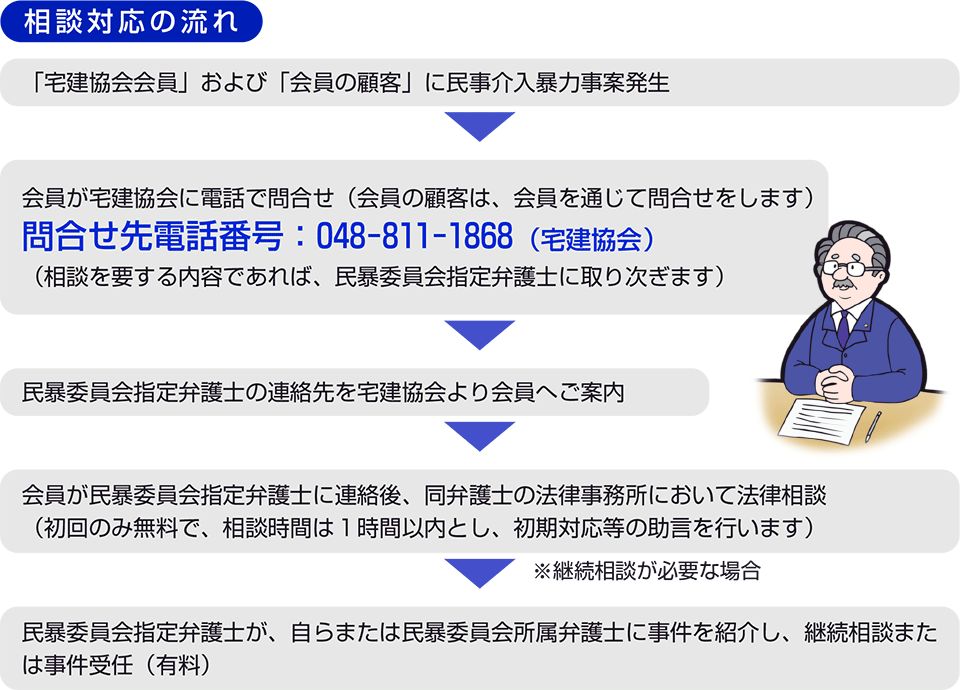 と連携して、会員および会員の顧客を対象とした「民事介入暴力事案に関する無料法律相談」を実施しています。埼玉弁護士会の「民事介入暴力対策委員会」の選任弁護士が初期対応等の助言を行います。