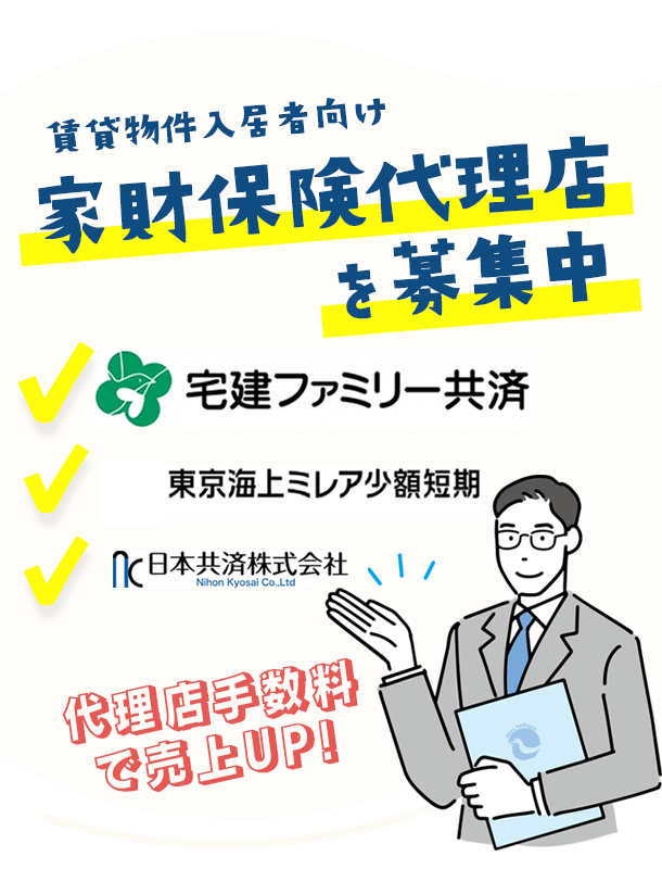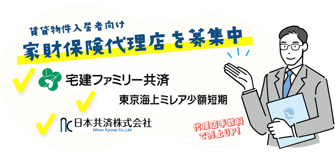 提携保険会社3社にて賃貸物件入居者向けの家財保険の代理店を募集しています。お客様を取り次いで代理店手数料につなげることができます。