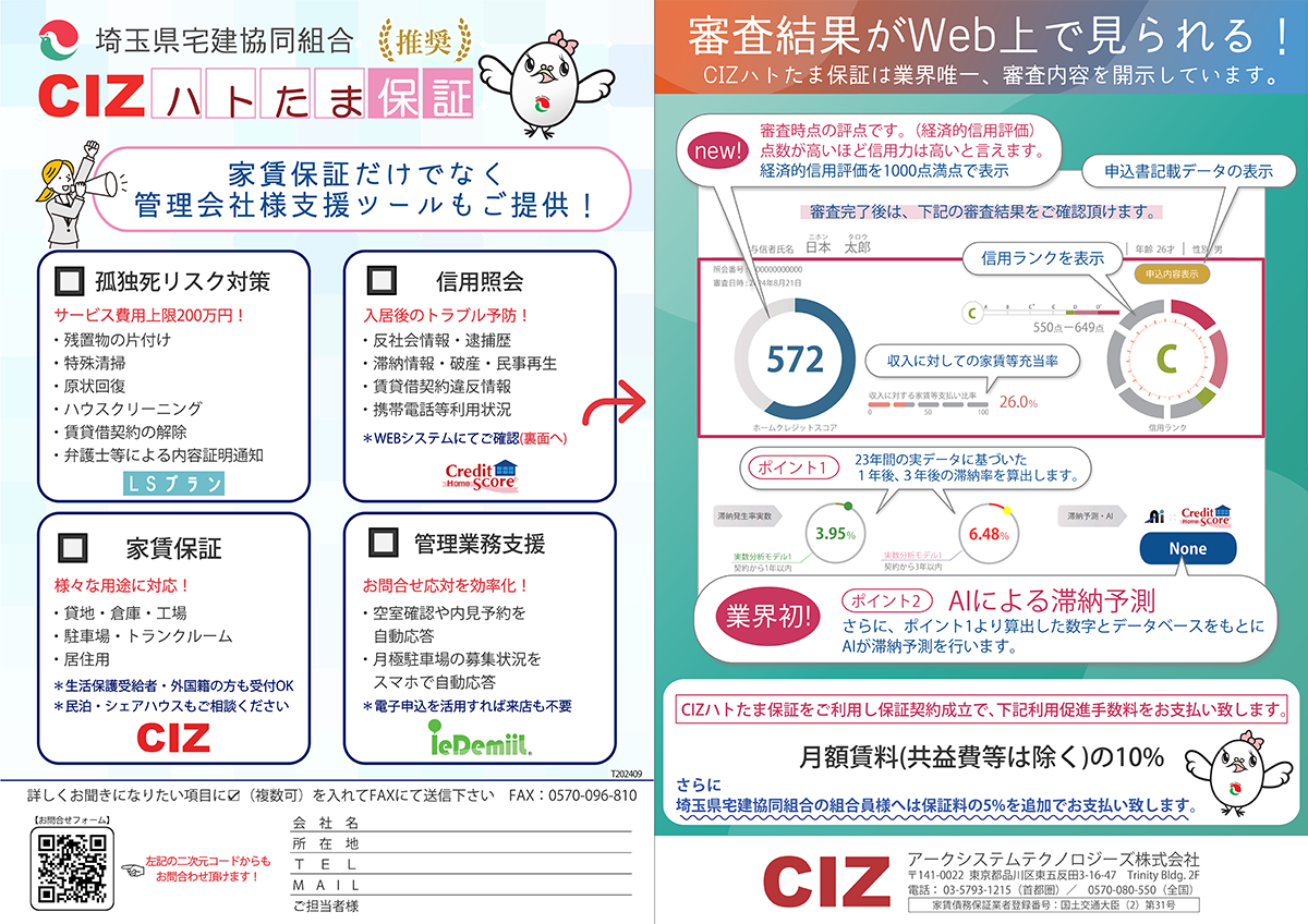 アークシステムテクノロジーズ株式会社によるCIZの入居審査は、申込者の審査結果をご利用会員様に開示しています。 審査内容は信用情報として自動的にデータベース化されます。更に入居中の延滞、滞納を始め、契約違反等の情報も登録することが出来るなど、不動産信用情報機関システムとしての役割を担っています。 これらの情報は不動産賃貸借のビッグデータとしてご利用の会員様へ様々な形でフィードバックしています。