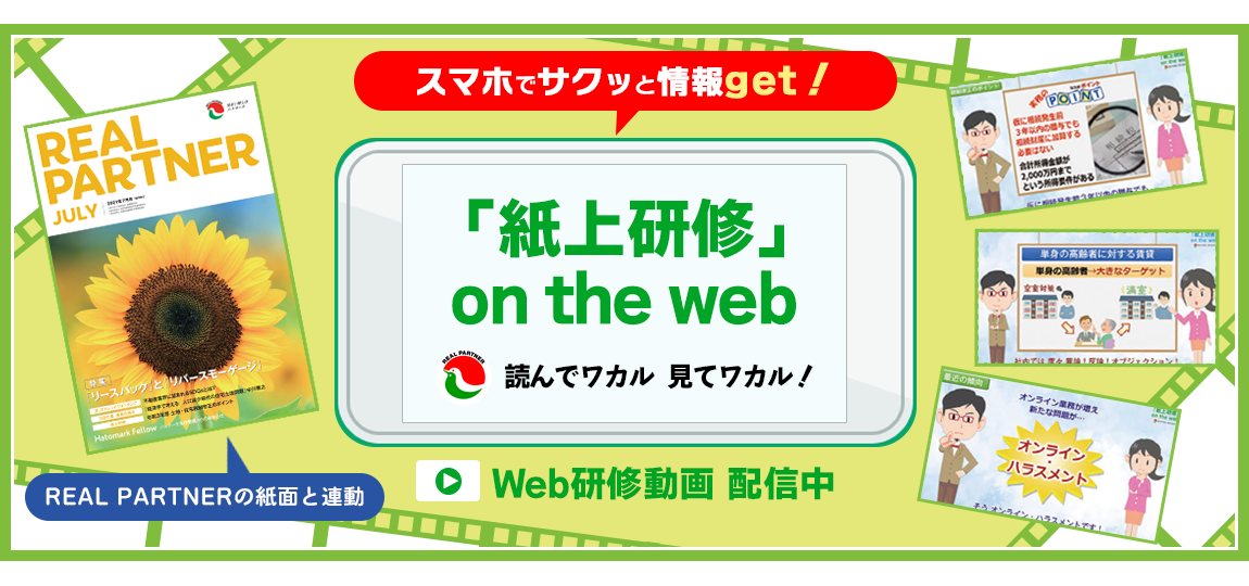 全宅保証では不動産総合情報誌「リアルパートナー」で連載中の人気紙面「紙上研修」をわかりやすく解説した動画を配信しています。ハトマークの会員であれば、お好きな時間に何回でも、どこでもご覧いただけます。