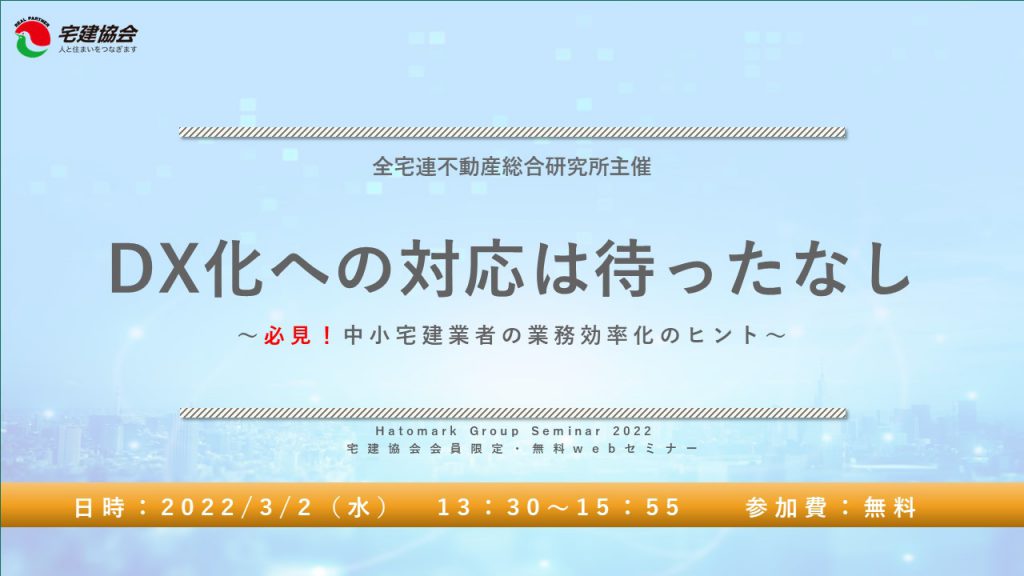 全宅連不動産総合研究所では、3月2日(水)に「DX化への対応は待ったなし~必見!中小宅建業者の業務効率化のヒント~」をテーマにWebセミナーを開催いたします。