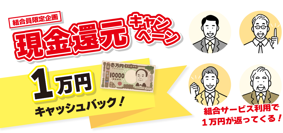 【組合員限定】現金1万円還元キャンペーン(埼玉県宅建協同組合) 組合サービス利用で1万円が返ってくる! 埼玉県宅建協同組合では、下記チラシのサービス1回のご利用につき1万円をキャッシュバックいたします(先着80件)。 複数回ご利用いただけますので、この機会にぜひ組合サービスをご活用ください。 また、組合未加入の方も、組合へのご加入との同時でのご利用も可能です。 →詳しくはこちら
