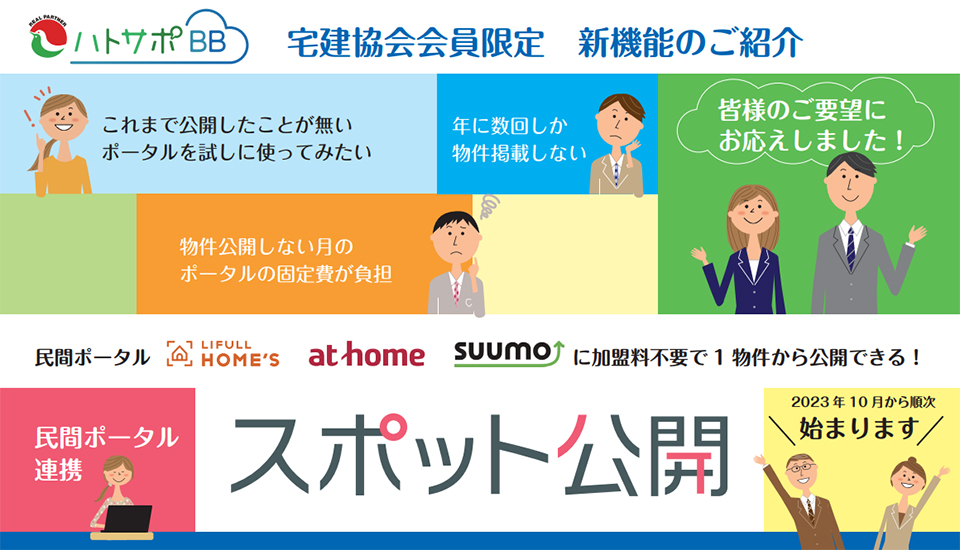 全宅連が提供するハトサポBBの「民間ポータル連携」新機能として「スポット公開」機能の提供が10月より随時開始されます。