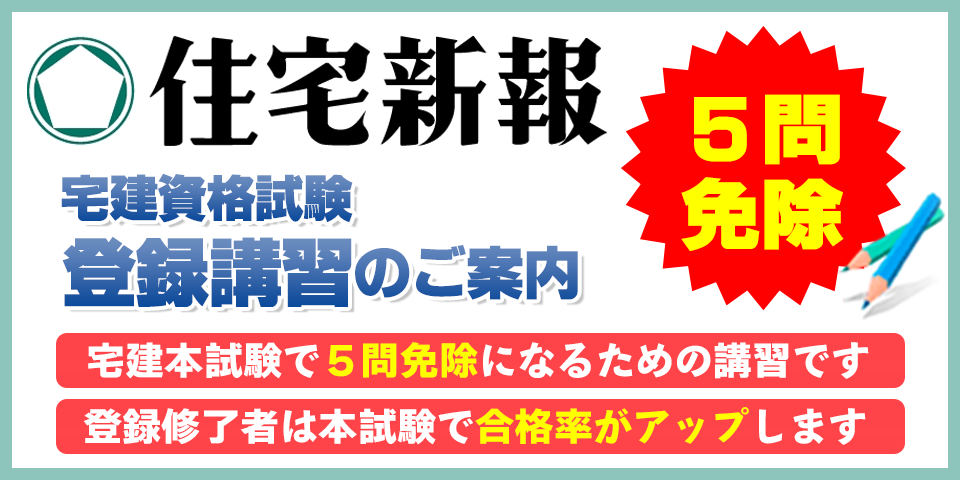 住宅新報「宅地建物取引士資格試験 登録講習(5問免除)」特別割引のご紹介 宅建試験の5問免除をご希望の方に朗報です! 宅建業に従事している方なら、どなたでも受講できます。 <ポイント!> ◎定価17,500円のところ→組合員9,800円(税込) ◎会場(大宮・浦和)またはオンラインでのスクーリングを選択できます! ※詳細は上バナーより、組合HPをご確認ください。