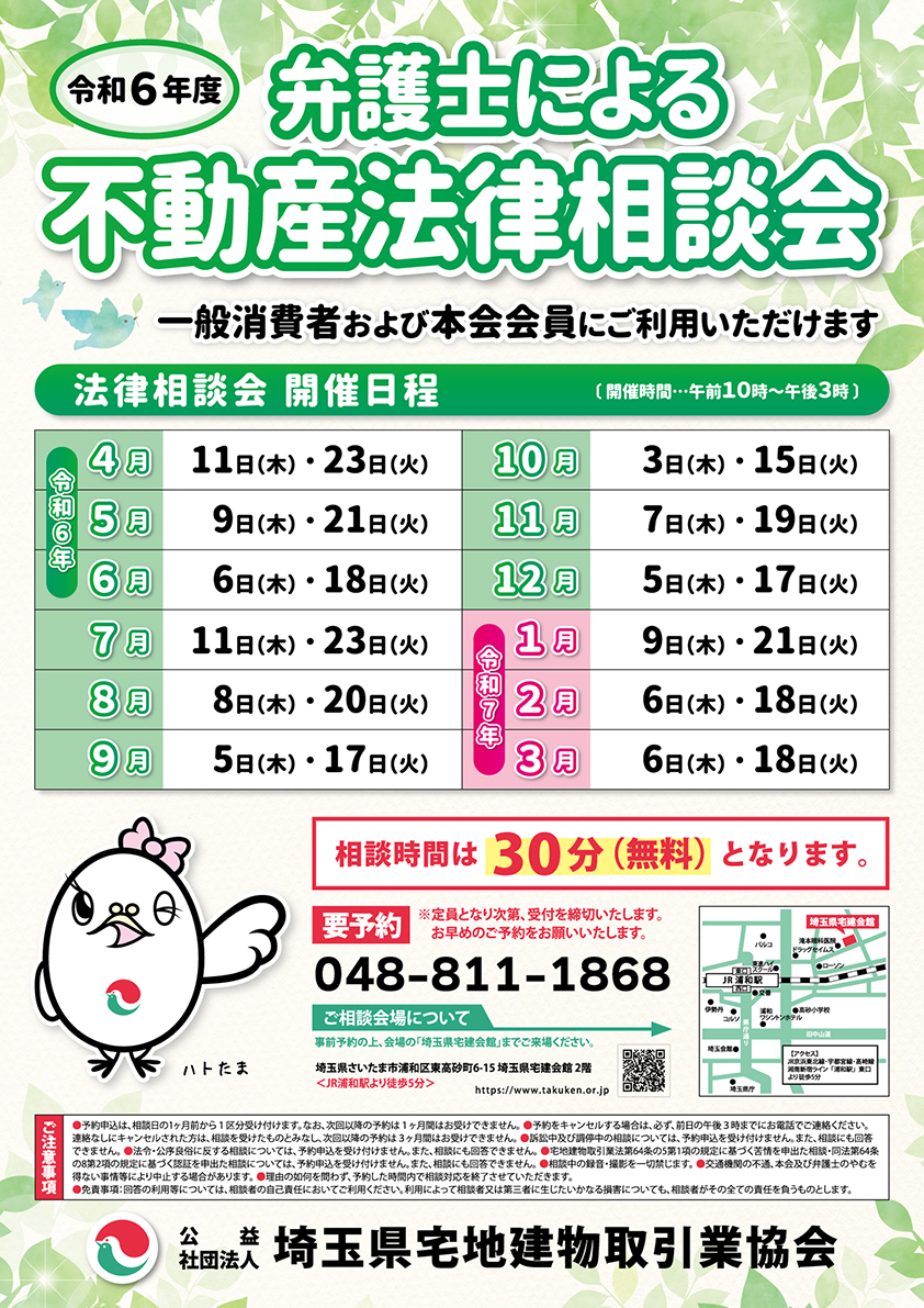会員の皆様におかれましては、3月にお送りする「会員直送便」で「令和6年度 弁護士による不動産法律相談会」のポスターと「利用上の注意事項」を同封いたしました。