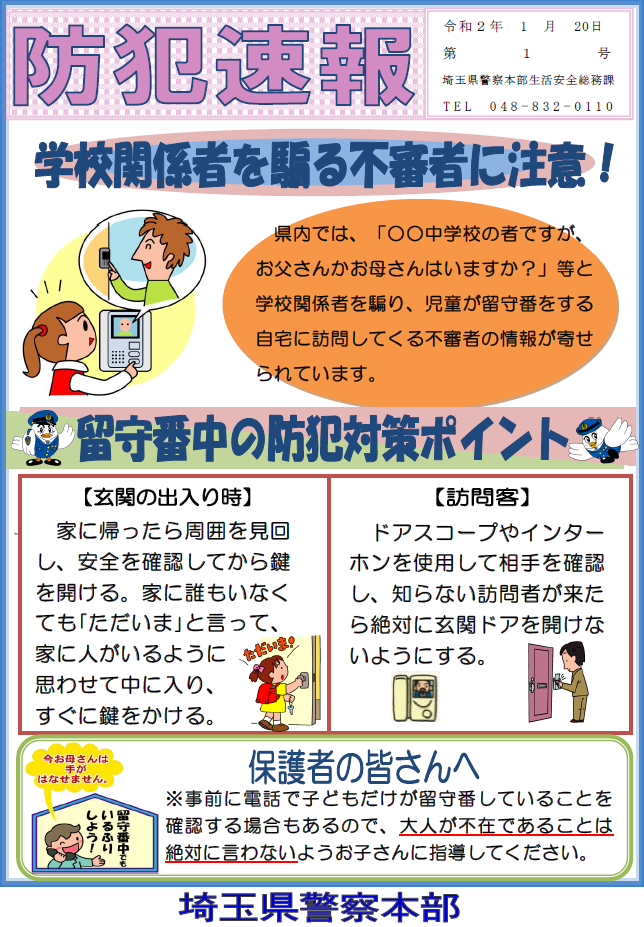 【埼玉県警】学校関係者を騙る不審者に注意!