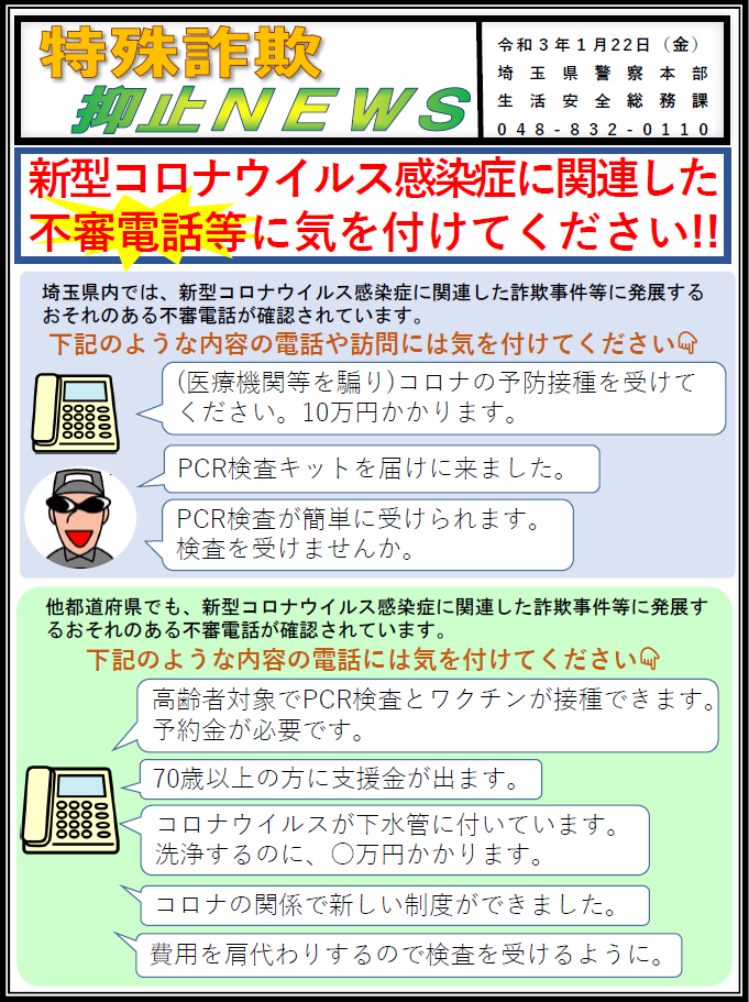【埼玉県警】特殊詐欺抑止NEWS「新型コロナウイルス感染症に関連した不審電話等に気を付けてください!!」 埼玉県警察本部より情報提供がございました。 日々の防犯対策や活動のためお役立てください。 →特殊詐欺抑止NEWS(PDF) →予兆多発地域(直近一週間のもの)・特殊詐欺の被害未然防止好事例・詐欺犯人からの電話内容(PDF)