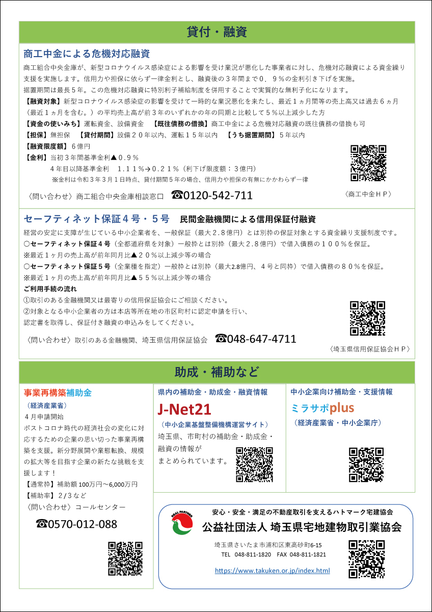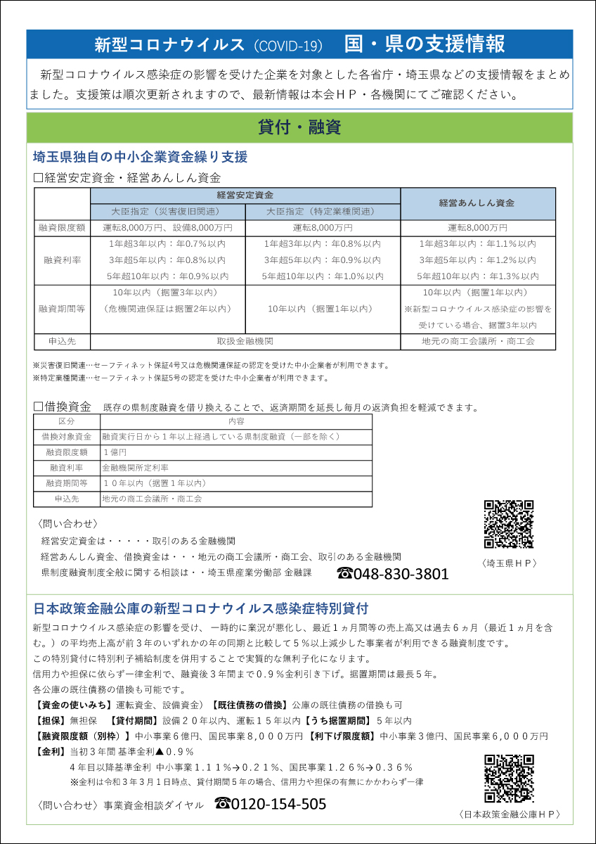 新型コロナウイルス関連 国・県などの支援情報をまとめました【更新】 新型コロナウイルス感染症の影響を受けた企業を対象とした各省庁・埼玉県などの支援情報をまとめました。支援策は順次更新されますので、最新情報は本会HP・各機関にてご確認ください。 →新型コロナウイルス関連 国・県などの支援情報(PDF)