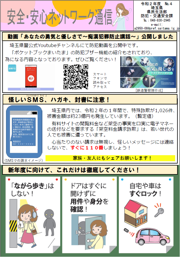 【埼玉県】「あなたの勇気と優しさで~痴漢犯罪防止講話~」を公開(安全・安心ネットワーク通信) 埼玉県(県民生活部 防犯・交通安全課)より情報提供がございました。 日々の防犯対策や活動のためお役立てください。 →安全・安心ネットワーク通信(PDF) →動画「あなたの勇気と優しさで~痴漢犯罪防止講話~」(Youtube 埼玉県警察公式チャンネル)