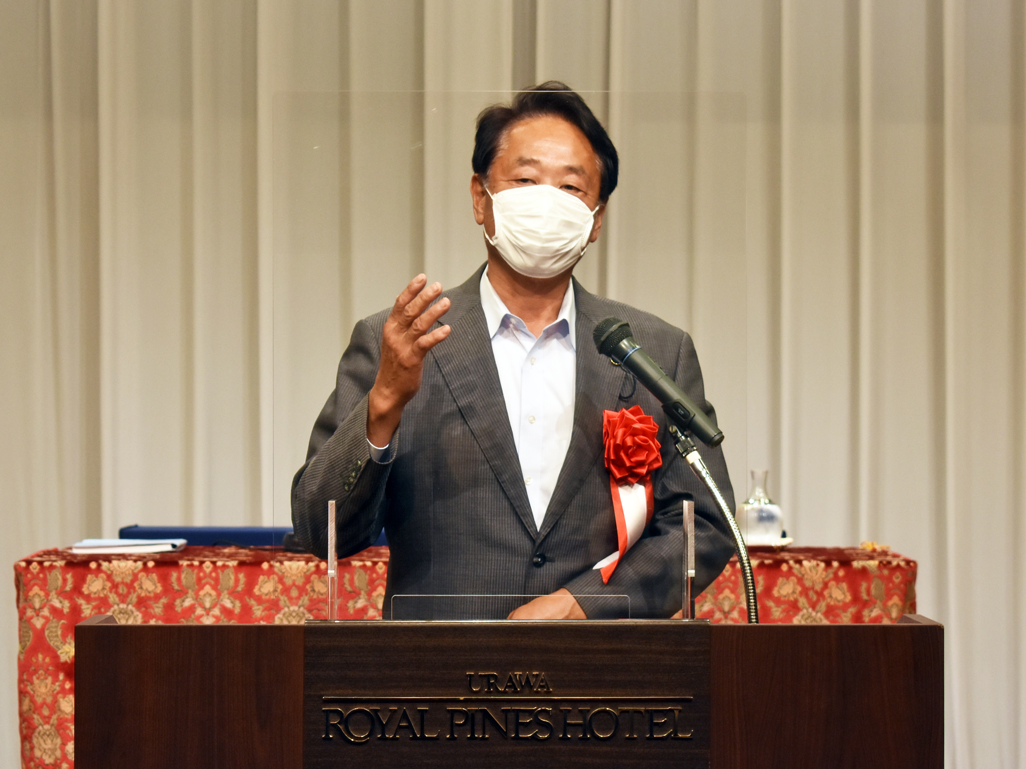 総会に先立ち、江原会長は挨拶の中で昨年度を振り返り、「コロナに始まりコロナに終わった。一日も早い終息を願っている。」として、「就任以来『1+三つの施策』を基本目標として、『安心・安全・満足の不動産取引を支えるハトマーク宅建協会』と三つの施策『収入の取れる稼げる宅建業者』『明るい宅建協会』『強い宅建協会』の実現を目指し、会務執行・事業推進を行ってきた。」と述べ、具体的には「新型コロナウイルス変革期に新しいビジネスモデル構築に取り組み、新しい生活様式を推進した。