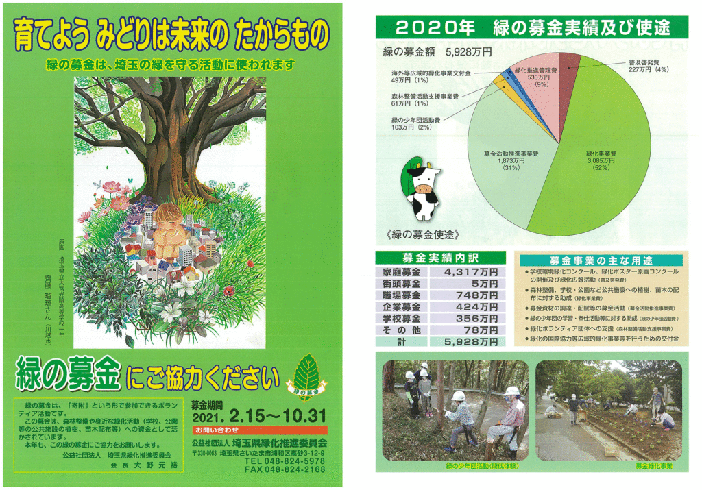 公益社団法人 埼玉県緑化推進委員会(会長:大野元裕知事)では、緑に親しみ健全で豊かな心を育み、住みよい緑豊かな埼玉づくりを進めるため、「緑の募金」活動を行っています。
