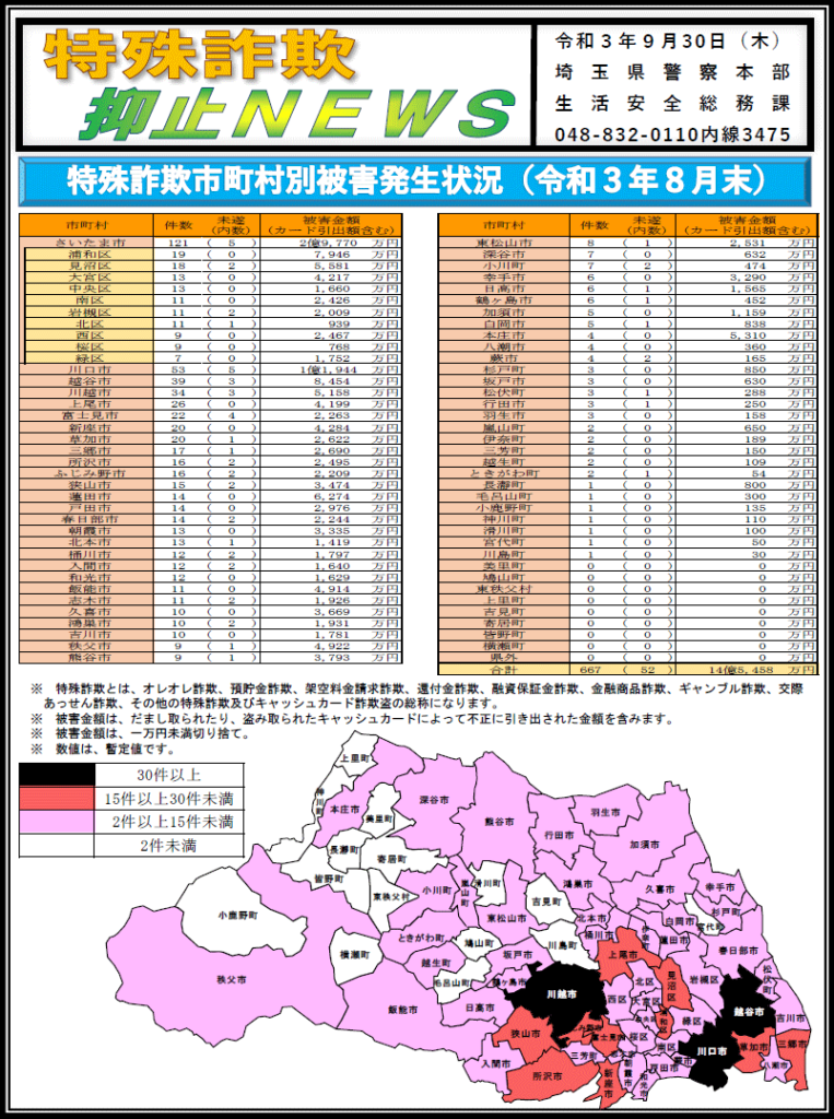 【埼玉県警】特殊詐欺抑止NEWS/最新の市区町村別 被害発生状況をチェック! 埼玉県警察本部より情報提供がございました。 日々の防犯対策や活動のためお役立てください。 埼玉県警「特殊詐欺抑止NEWS」(PDF)
