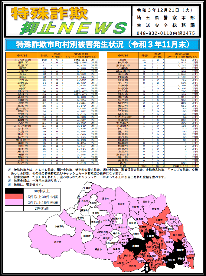 【埼玉県警】特殊詐欺抑止NEWS/最新の市区町村別 被害発生状況をチェック! 埼玉県警察本部より情報提供がございました。 日々の防犯対策や活動のためお役立てください。 埼玉県警「特殊詐欺抑止NEWS」(PDF)