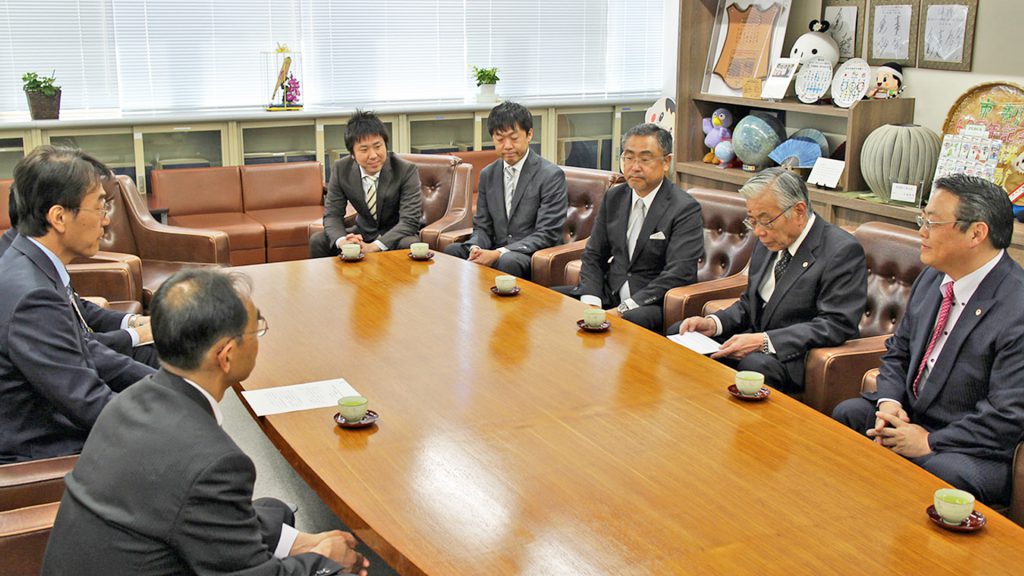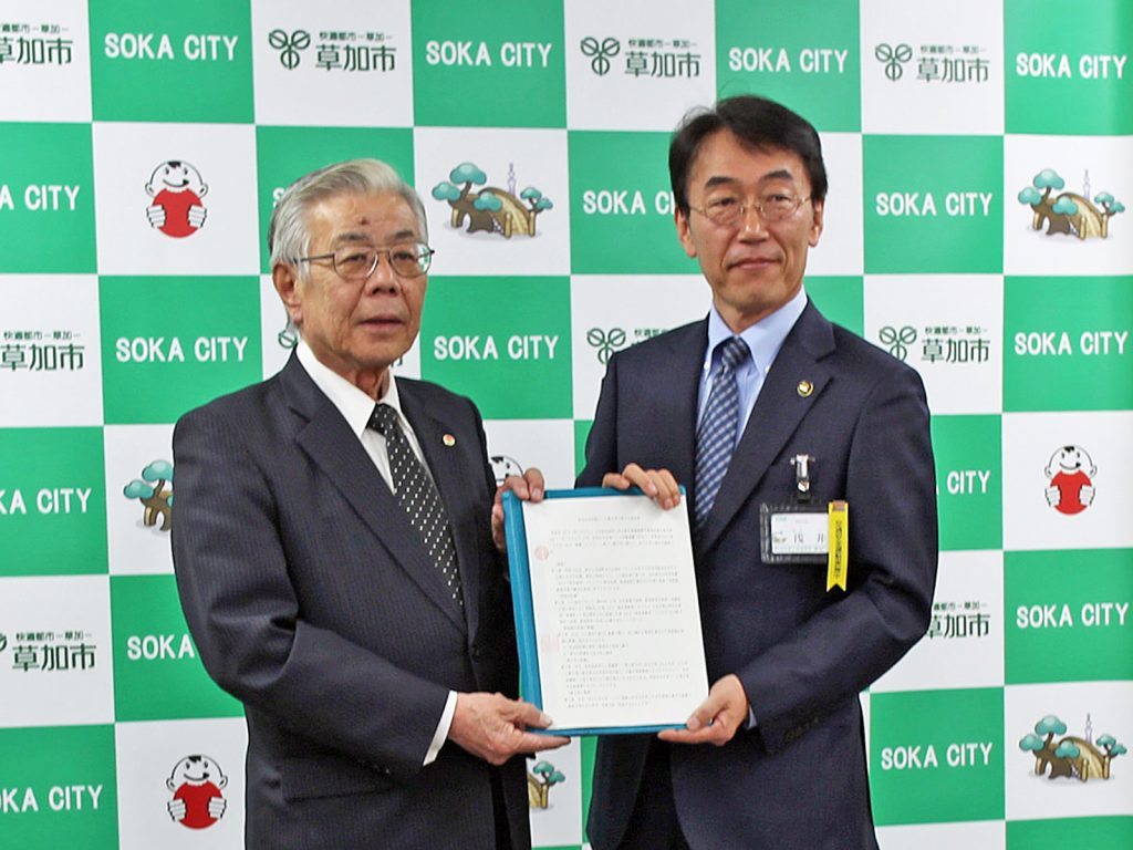 草加市の浅井昌志市長(右)と本会埼玉東支部の榎本隆雄支部長(左)