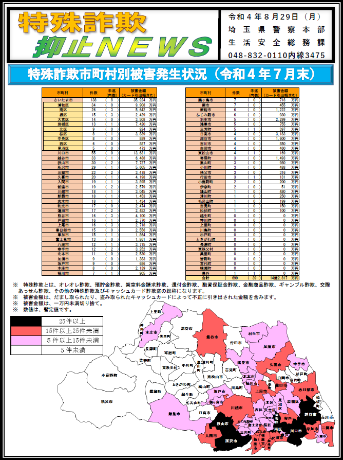 【埼玉県警】特殊詐欺抑止NEWS/市町村別被害発生状況(令和4年7月末) 埼玉県警察本部より情報提供がございました。 日々の防犯対策や活動のためお役立てください。 →埼玉県警「特殊詐欺抑止NEWS」(PDF)