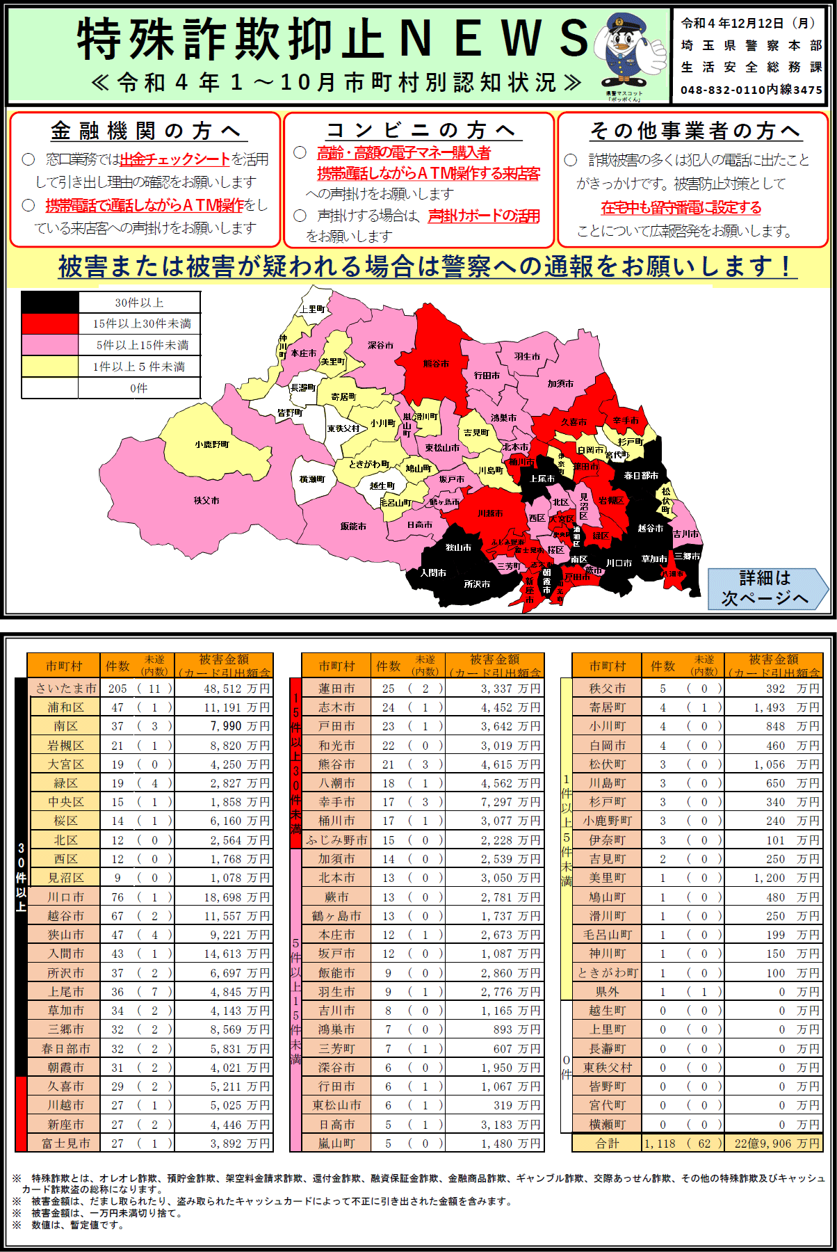 【埼玉県警】特殊詐欺抑止NEWS/市町村別被害発生状況(令和4年10月末) 埼玉県警察本部より情報提供がございました。 日々の防犯対策や活動のためお役立てください。 →埼玉県警「特殊詐欺抑止NEWS」(PDF)