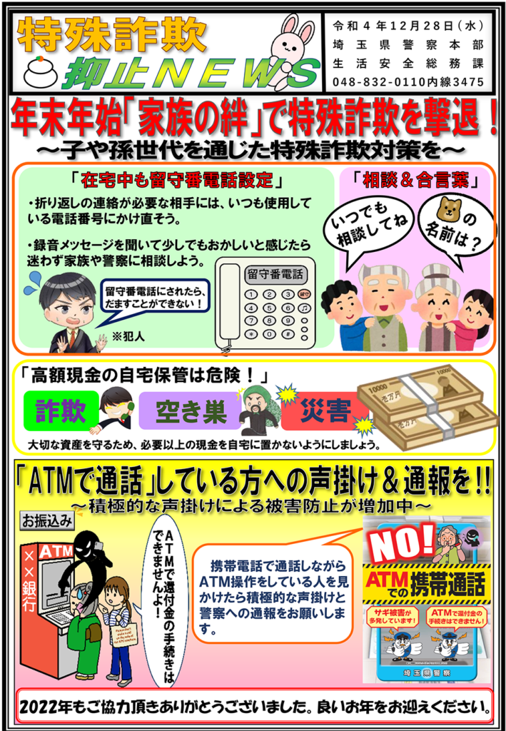 【埼玉県警】特殊詐欺抑止NEWS(年末年始「家族の絆」で特殊詐欺を撃退!) 埼玉県警察本部より情報提供がございました。 日々の防犯対策や活動のためお役立てください。 →埼玉県警「特殊詐欺抑止NEWS」(PDF)