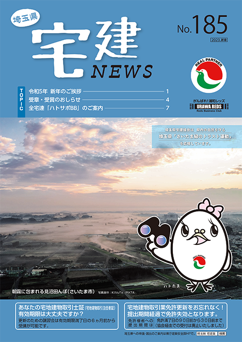 広報誌「宅建NEWS」No.185 をWebで先行公開しました 本会発行の広報誌「宅建NEWS」の最新号(No.185)をWebで先行公開いたしました。 主なタイトルは次のようになっています。 ■令和5年度 新年のご挨拶 ■受章・受賞のおしらせ ■全宅連「ハトサポBB」のご案内 会員の皆様には、今月下旬の「会員直送便」にて発送いたします! → 広報誌「宅建NEWS」