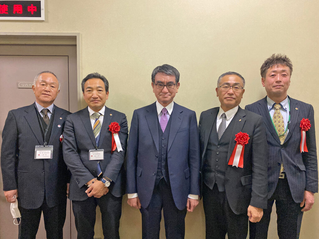 左から上野情報・政策・業務支援委員長(越谷支部)、飯田会長(越谷支部)、河野大臣、木村支部長(埼玉東支部)、三城支部長(埼葛支部)