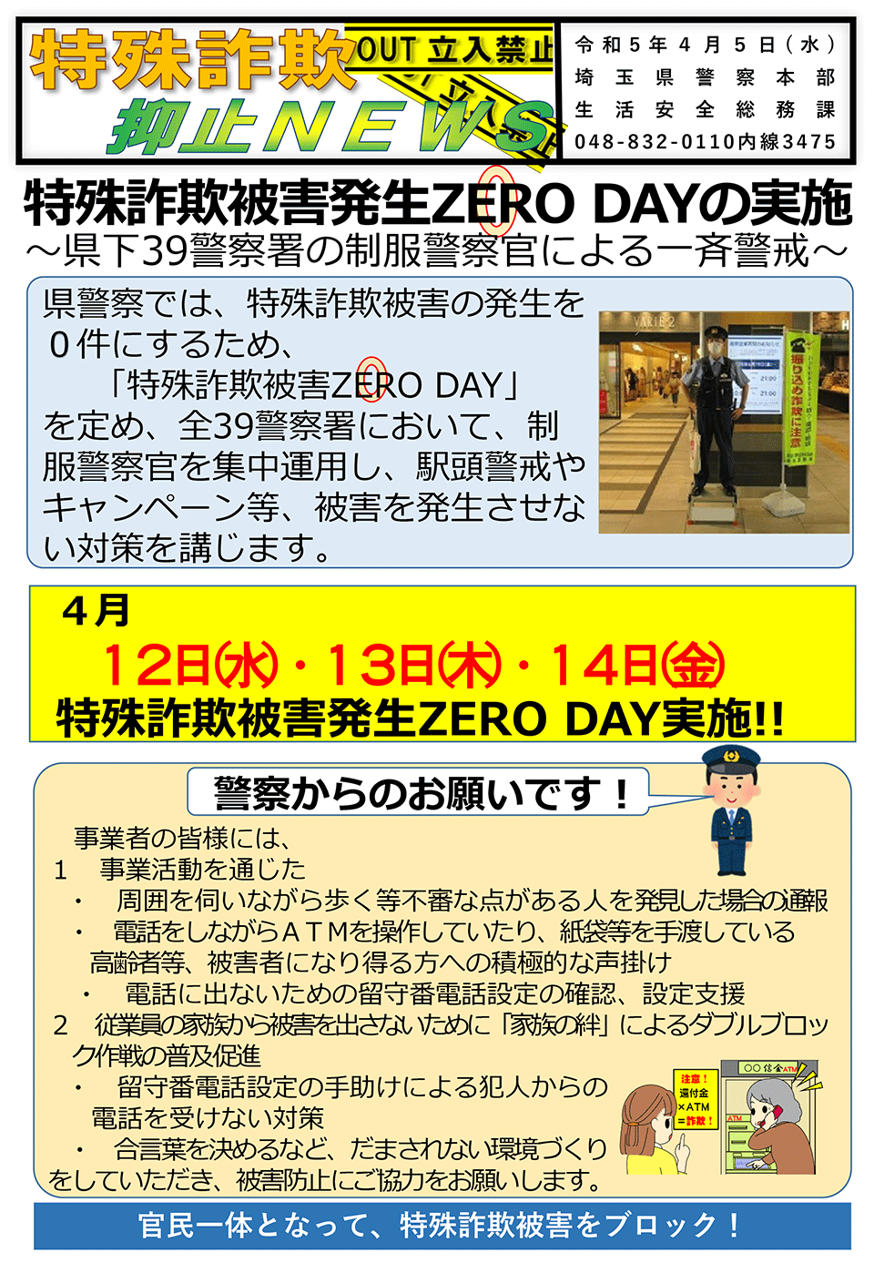 【埼玉県警】特殊詐欺抑止NEWS「特殊詐欺被害発生ZERO DAY」の実施(4/12・13・14) 埼玉県警察本部より情報提供がございました。 日々の防犯対策や活動のためお役立てください。 →埼玉県警「特殊詐欺抑止NEWS」(PDF)