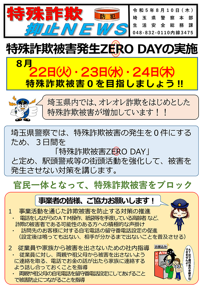 【埼玉県警】特殊詐欺抑止NEWS「特殊詐欺被害発生ZERO DAY」実施へご協力ください(8/22-24) 埼玉県警察本部より情報提供がございました。 日々の防犯対策や活動のためお役立てください。 →埼玉県警「特殊詐欺抑止NEWS」(PDF)