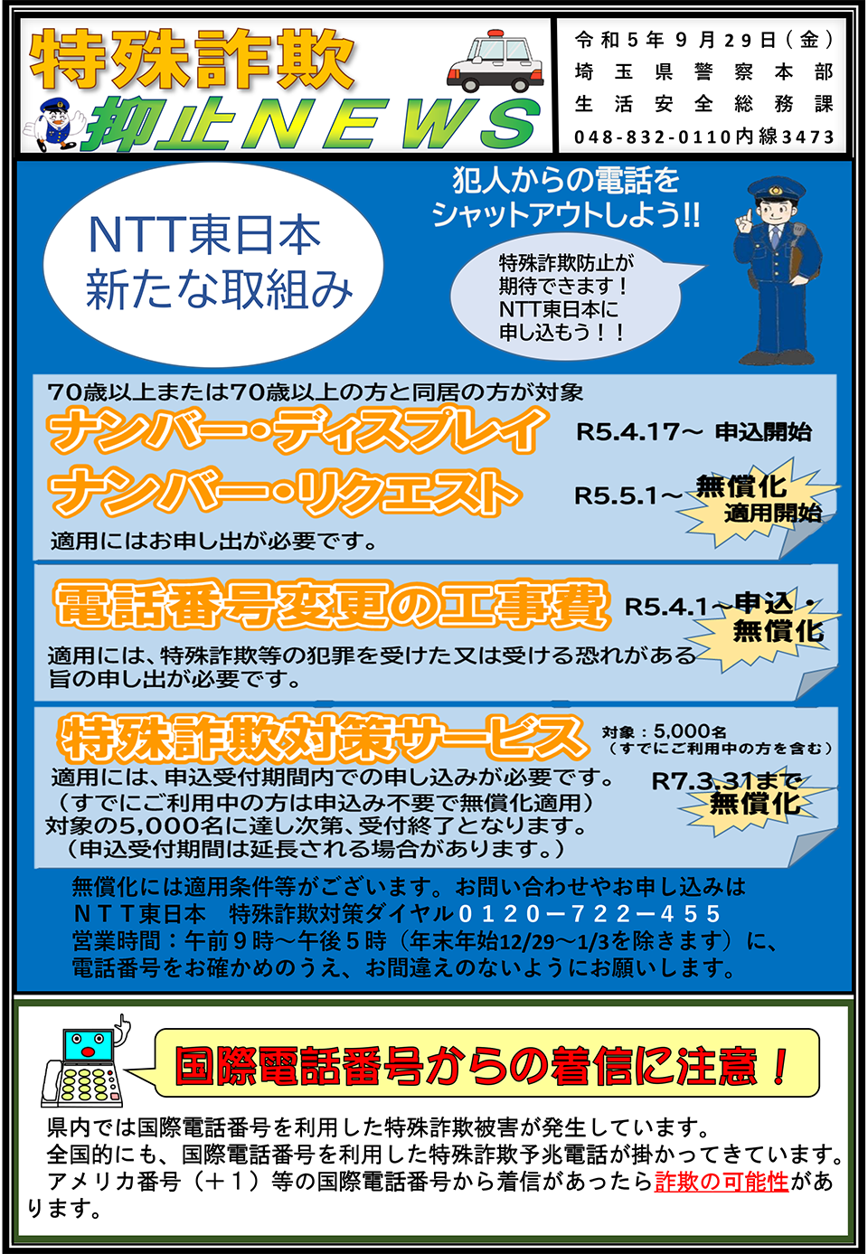 【埼玉県警】特殊詐欺抑止NEWS「犯人からの電話をシャットアウト!NTT東日本新たな取組」 埼玉県警察本部より情報提供がございました。 日々の防犯対策や活動のためお役立てください。 →埼玉県警「特殊詐欺抑止NEWS」(PDF)