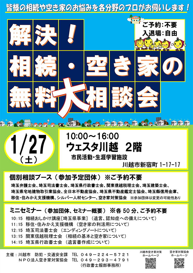 川越市では、「相続」や「空き家」に関する無料の相談会やミニセミナーを開催します。ご予約不要・入退場自由にてご利用いただけますので、ぜひご参加ください。