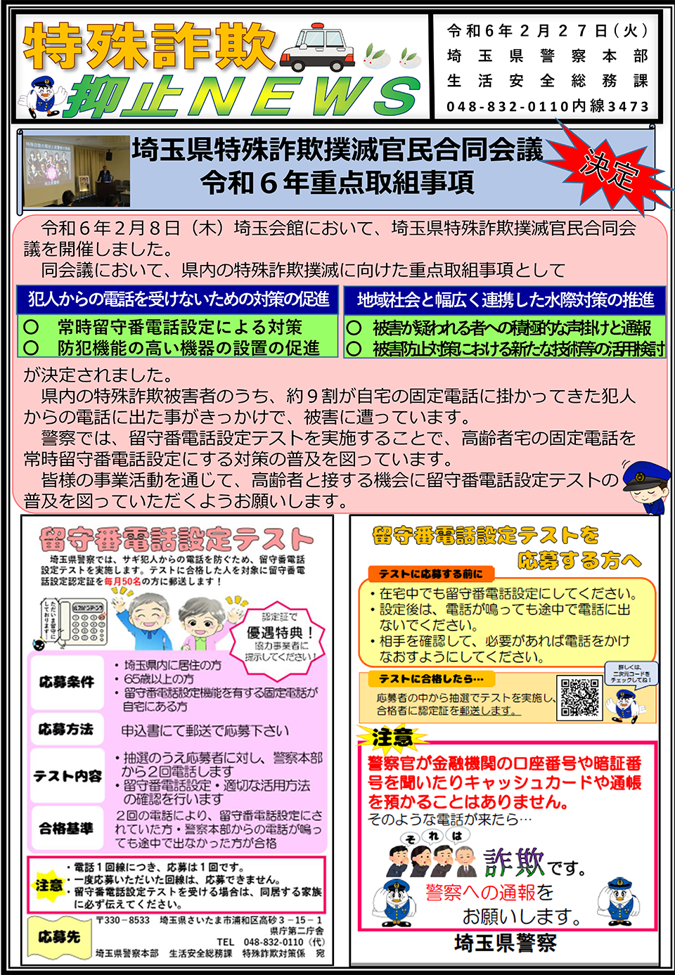 【埼玉県警】特殊詐欺抑止NEWS「埼玉県特殊詐欺撲滅官民合同会議 令和6年 重点取組事項」 埼玉県警察本部より情報提供がございました。 日々の防犯対策や活動のためお役立てください。 →埼玉県警「特殊詐欺抑止NEWS」(PDF) →埼玉県特殊詐欺撲滅官民合同会議 令和6年 重点取組事項(PDF)