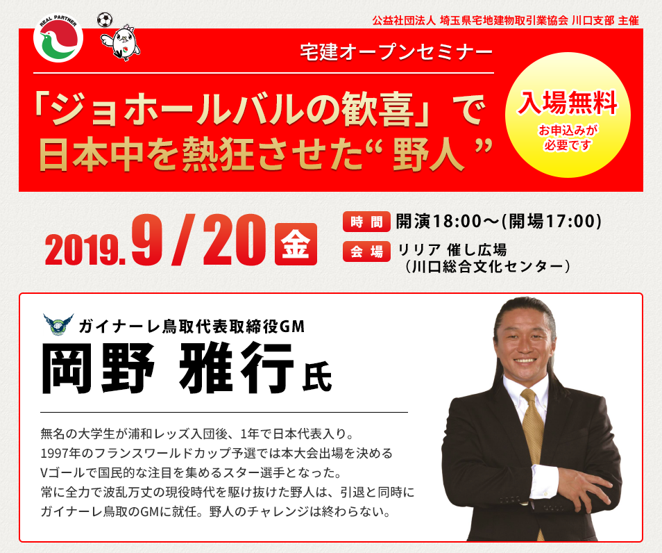 本会 川口支部では、9月20日(金)に「宅建オープンセミナー」として、サッカー元日本代表“野人”こと岡野雅行さんを講師にお招きして講演会を開催いたします。