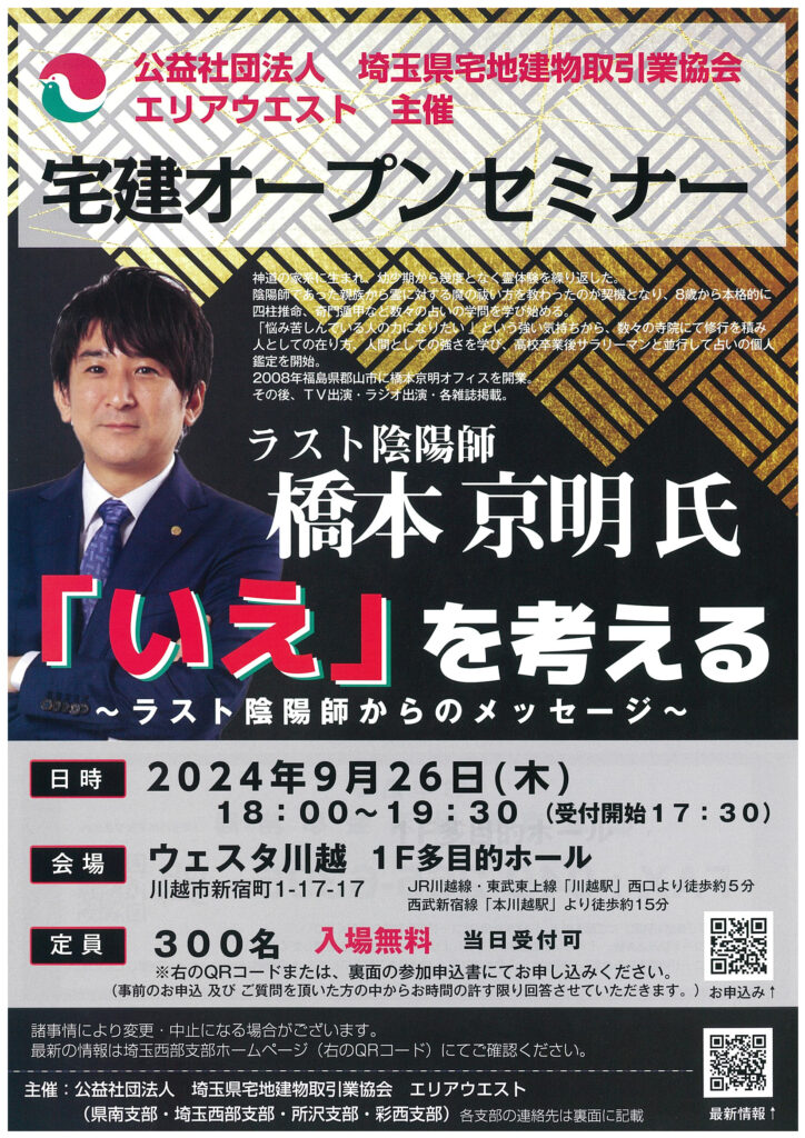 YouTubeチャンネル登録者数61万人の”ラスト陰陽師”こと橋本 京明 氏をお招きし、最も身近な存在のひとつである「いえ」をテーマに開運術など楽しく学んでいきましょう!