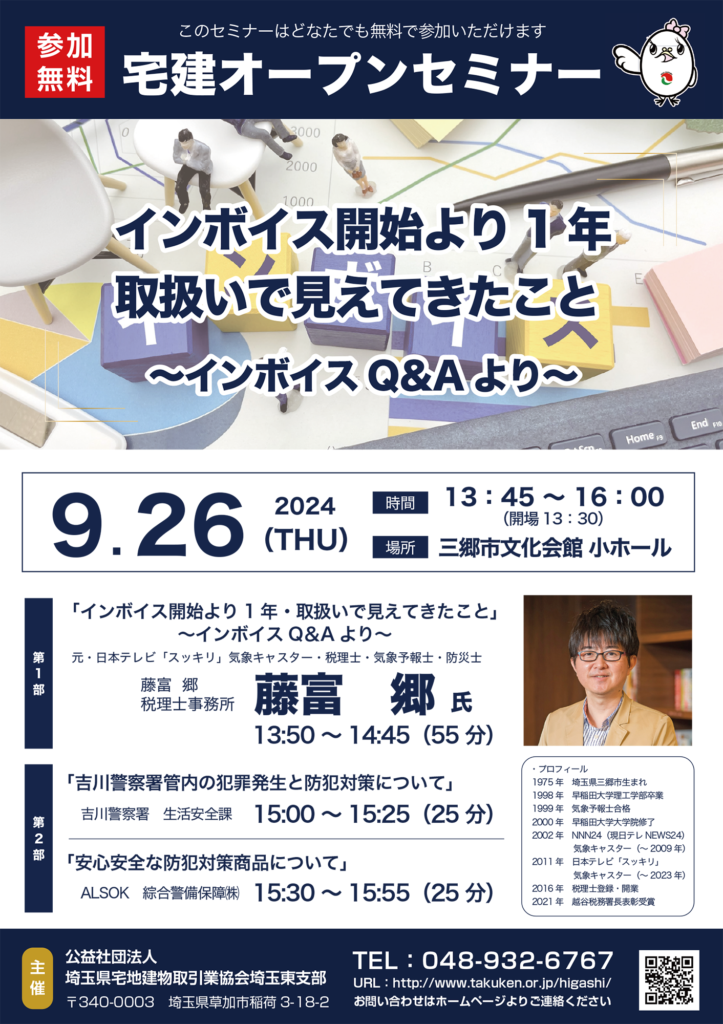 元・日本テレビ「スッキリ」気象キャスター・気象予報士・防災士・税理士と多彩な肩書を持つ 藤富 郷 氏をお招きし「インボイス開始より1年・取り扱いで見えてきたこと」をテーマに実務に即したセミナーを開催いたします!