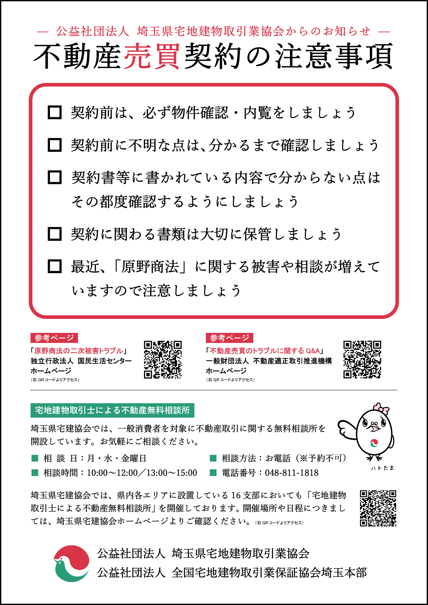 【消費者の皆様へ】不動産契約時の注意事項をまとめました(チェックして安心!) 消費者の皆様が、住宅の賃貸借契約や不動産の売買契約を締結する際の注意事項を簡潔にまとめました。 安心・安全な取引を行うために、下のリストをぜひチェックしてみてください。 住宅賃貸借契約の注意事項(PDF) 不動産売買契約の注意事項(PDF)