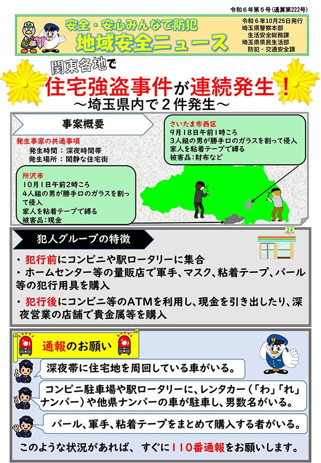 【埼玉県警】地域安全ニュース/関東各地で住宅強盗事件が連続発生!