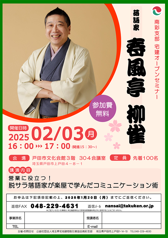 落語家の 春風亭 柳雀 さんをお招きし「営業に役立つ! 脱サラ落語家が楽屋で学んだコミュニケーション術」をテーマに実務にも即したセミナーを下記の通り開催いたします。