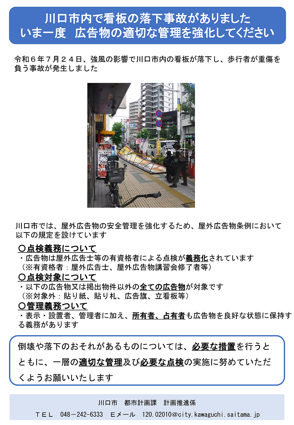 令和6年7月24日、川口市内において看板が落下し、歩行者が重傷を負う事故が発生しました。