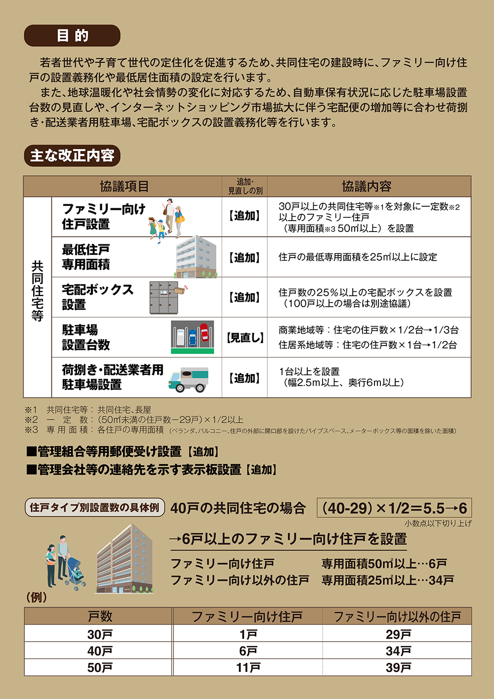 主な改正内容は、「ファミリー向け住戸設置」、「最低住戸専用面積の設定」、「宅配ボックス設置」、「荷捌き・配送業者用駐車場設置」、「駐車場台数の見直し」です。