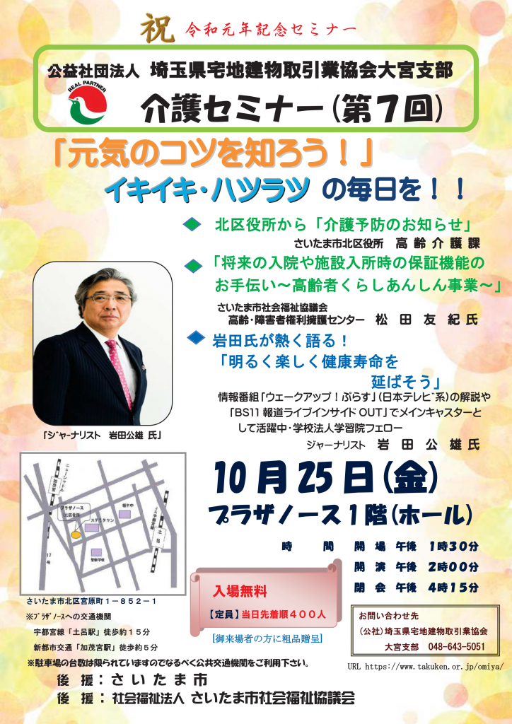 10月25日(金)にさいたま市北区の「プラザノース」にて、今回で7回目となる『介護セミナー』を本会大宮支部が開催いたしました。
