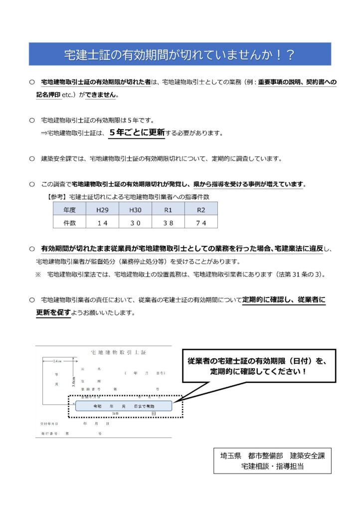 宅地建物取引業に従事する宅地建物取引士の方で、宅地建物取引士証の有効期限が切れてしまう方が増えていることから、埼玉県より有効期限を定期的に確認するよう、お知らせがありました。