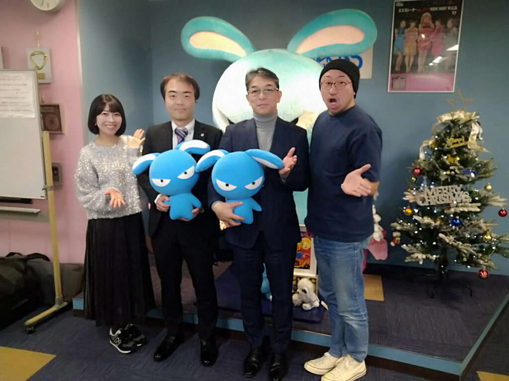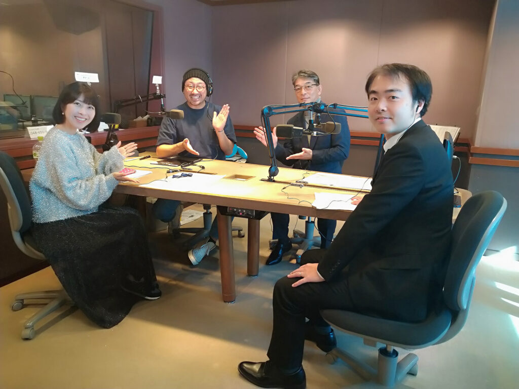 スタジオ収録では、番組パーソナリティのHappyだんばらさん(中央左)と小尾 渚沙(左)さんの進行のもと、当会の松島 義浩 専務理事(中央右)と今井 崇仁 課長(右)が出演いたしました。