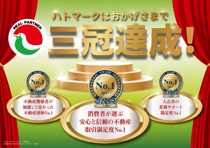 公益社団法⼈全国宅地建物取引業協会連合会(全宅連)、公益社団法⼈全国宅地建物取引業保証協会(全宅保証)は、このたび株式会社⽇本マーケティングリサーチ機構に委託実施した「不動産取引に関するインターネット調査」において、ハトマークが「消費者が選ぶ安⼼と信頼の不動産取引満⾜度No.1」「不動産関係者が加盟して良かった不動産団体No.1」「⼊会者の業務サポート満⾜度No.1」を得られたことをお知らせいたします。