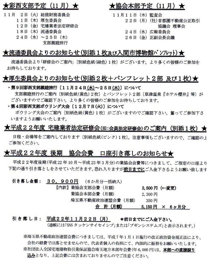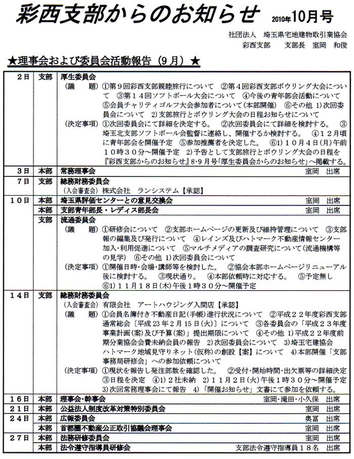 社団法人 埼玉県宅地建物取引業協会「彩西支部からのお知らせ」2010年10月号 |