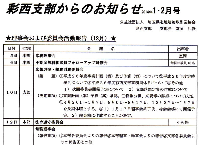 公益社団法人 埼玉県宅地建物取引業協会「彩西支部からのお知らせ」2014年1月・2月号(1)