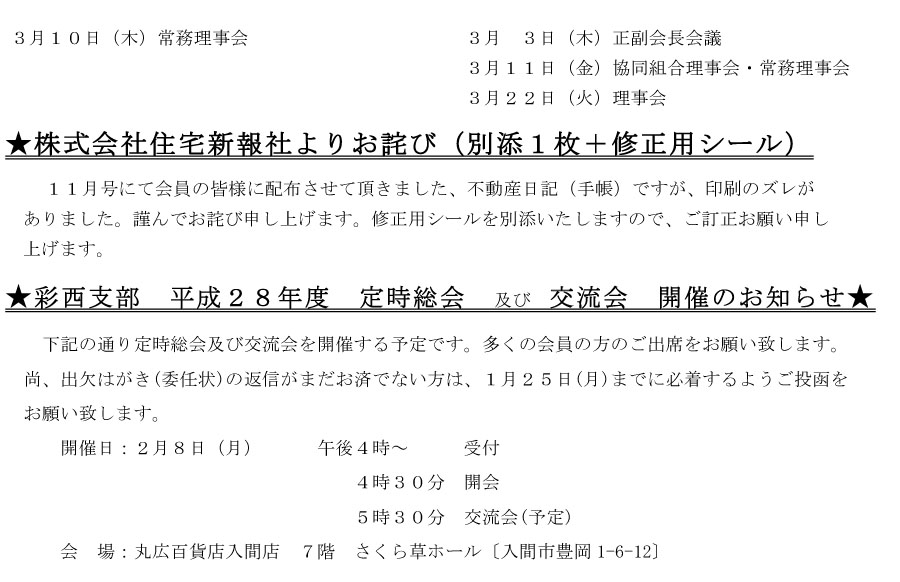 ※ご意見・ご希望等ございましたら 彩西支部事務局(柴田・山下)までご連絡ください。 Tel 04-2969-6060 Fax 04-2969-6075 (受付時間 月・火・木・金曜日 午前10時〜午後4時)