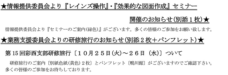※ご意見・ご希望等ございましたら 彩西支部事務局(柴田・山下)までご連絡ください。 Tel 04-2969-6060 Fax 04-2969-6075 (受付時間 月・火・木・金曜日 午前10時〜午後4時)