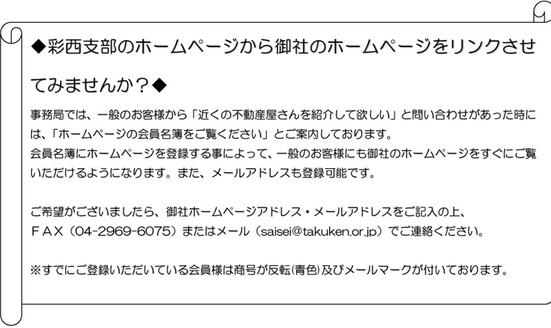 Copyright(C)2016 (公社)埼玉県宅地建物取引業協会彩西支部. All rights reserved.