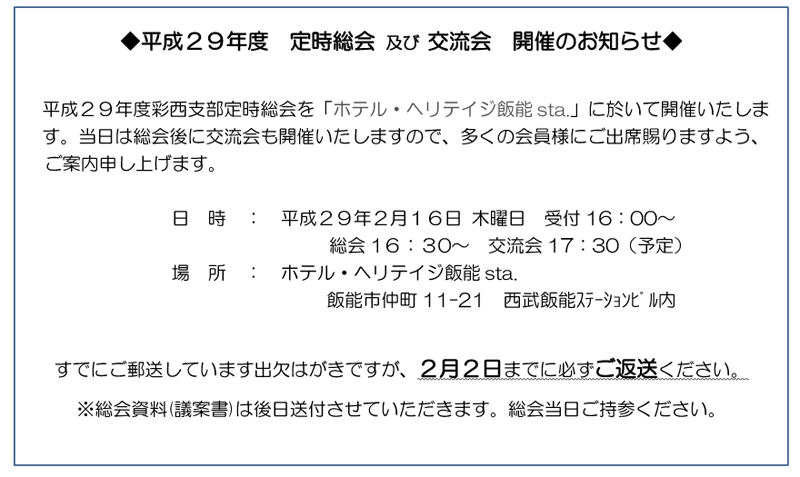 ※ご意見・ご希望等ございましたら 彩西支部事務局(柴田・山下)までご連絡ください。 Tel 04-2969-6060 Fax 04-2969-6075 (受付時間 月・火・木・金曜日 午前10時〜午後4時)